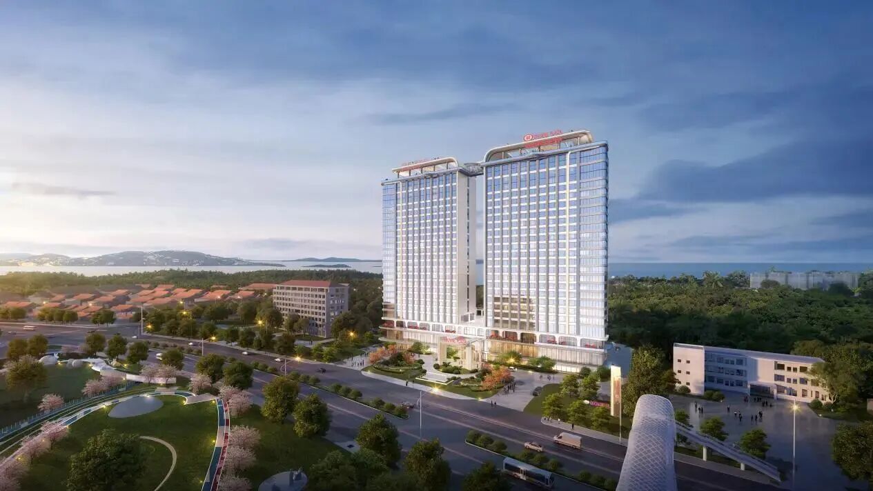 在立面设计方面,众合设计院项目团队深入挖掘在地性元素,将扬起的风帆、飞翔的海鸥等海洋意象融入建筑立面造型语言,同时以同心交织的空中连廊作为视觉纽带,诠释出现代化的地标性酒店形象。